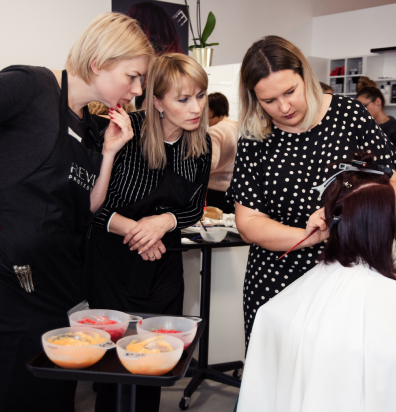 HAIR EXPERT treneriams privalu demonstruoti dažymo techniką ir principus ant manekenų bei konkrečiam kursui specialiai parinktų modelių.