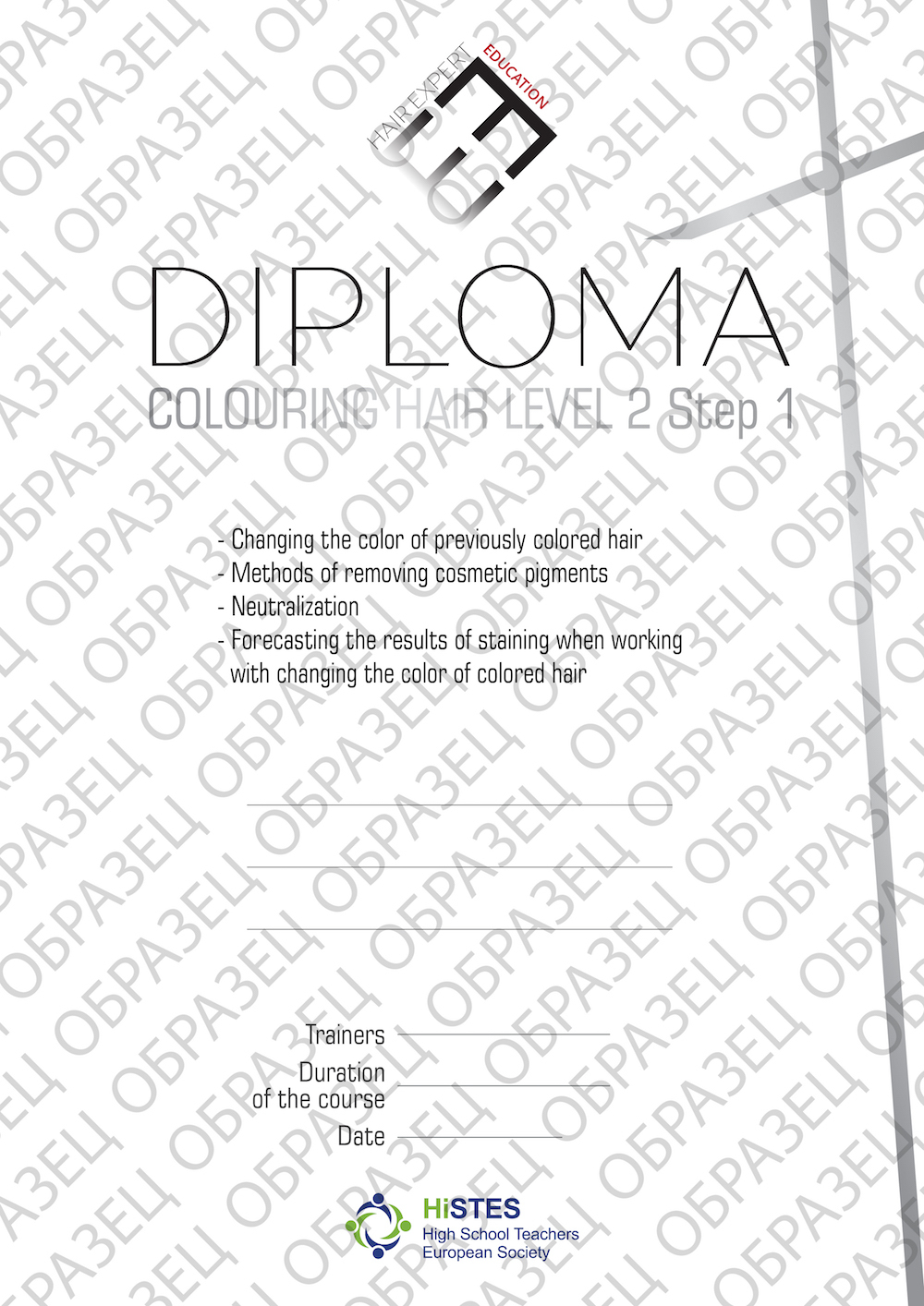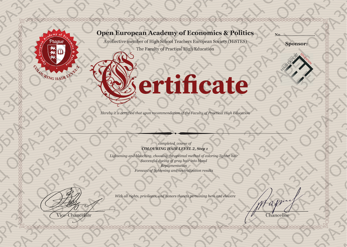 Meistrai, sėkmingai užbaigę kiekvieną kurso dalį, gauna HAIR EXPERT diplomą bei Atvirosios europietiškos ekonomikos ir politikos akademijos praktinio švietimo fakulteto (Praha) tarptautinį sertifikatą.